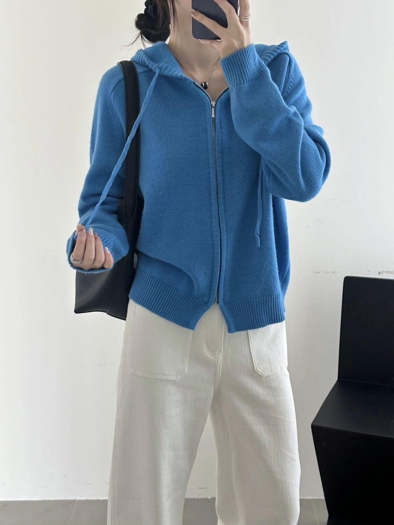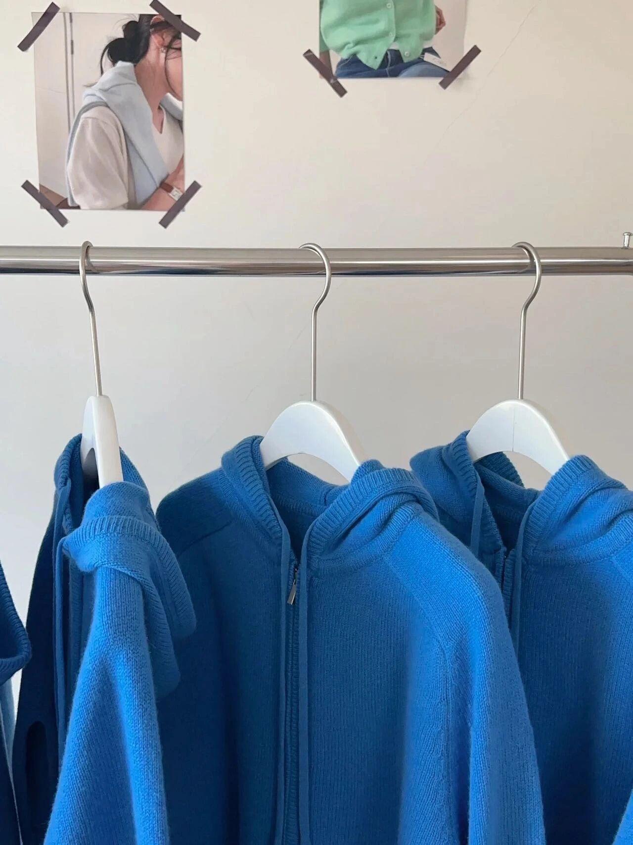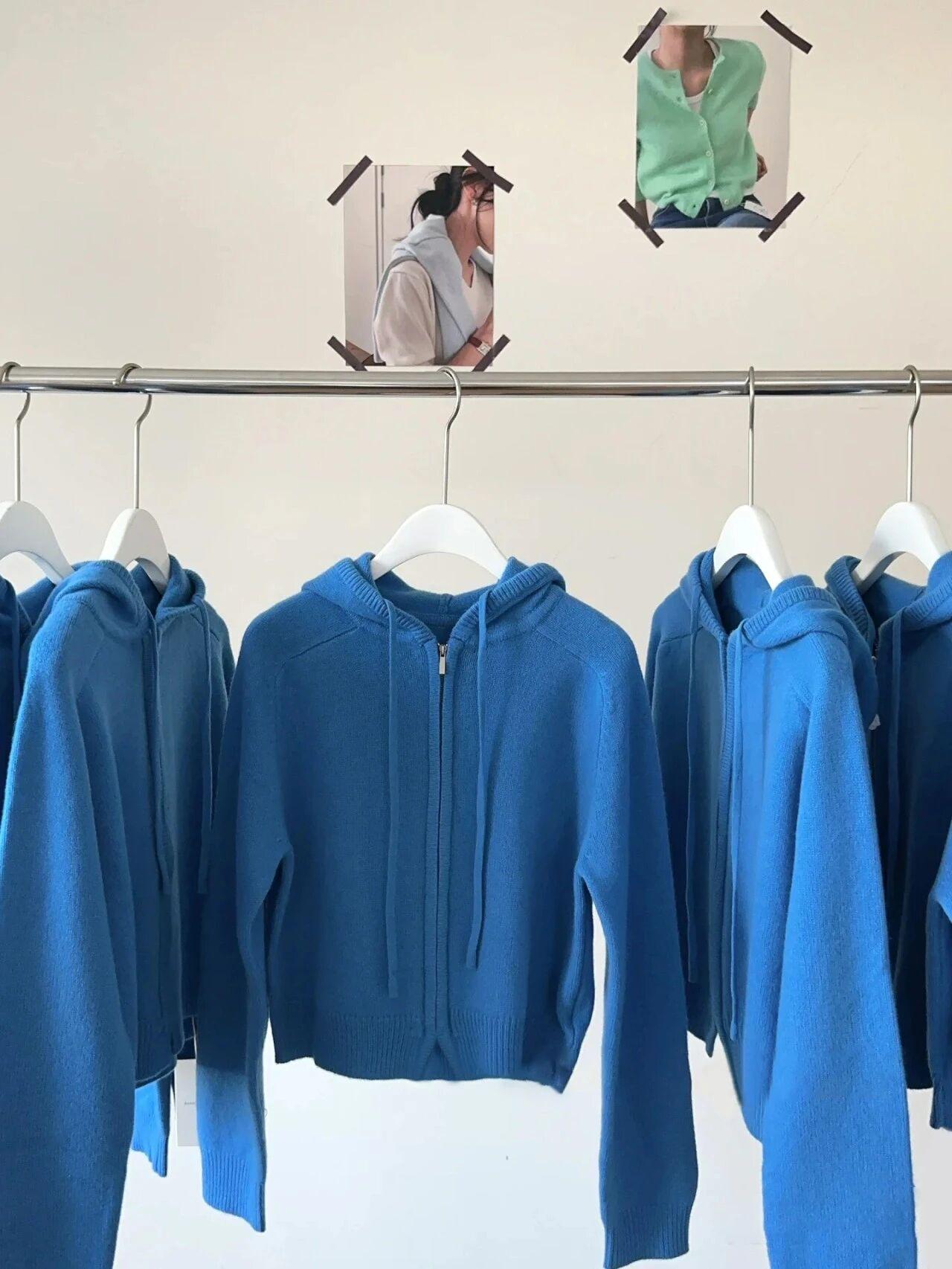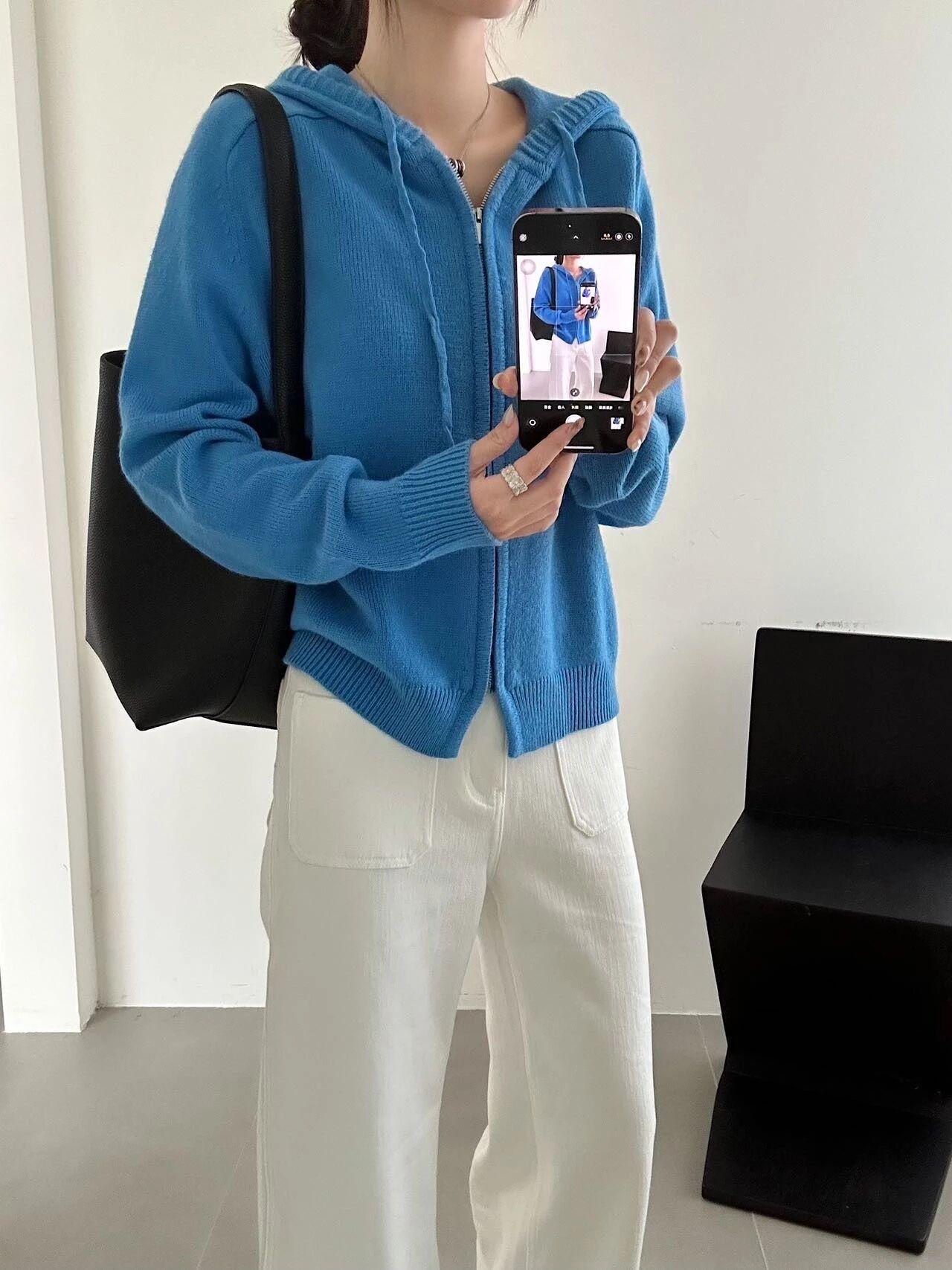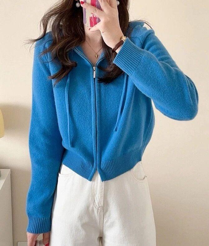 我最近又给大家找到了一款超正超有范儿,爆炸显白的蓝拉链连帽针织开衫。