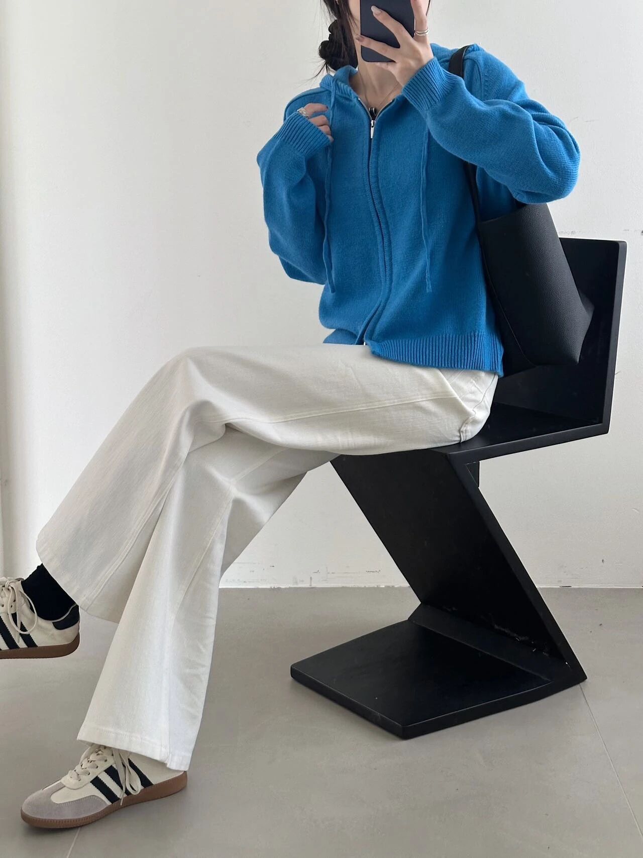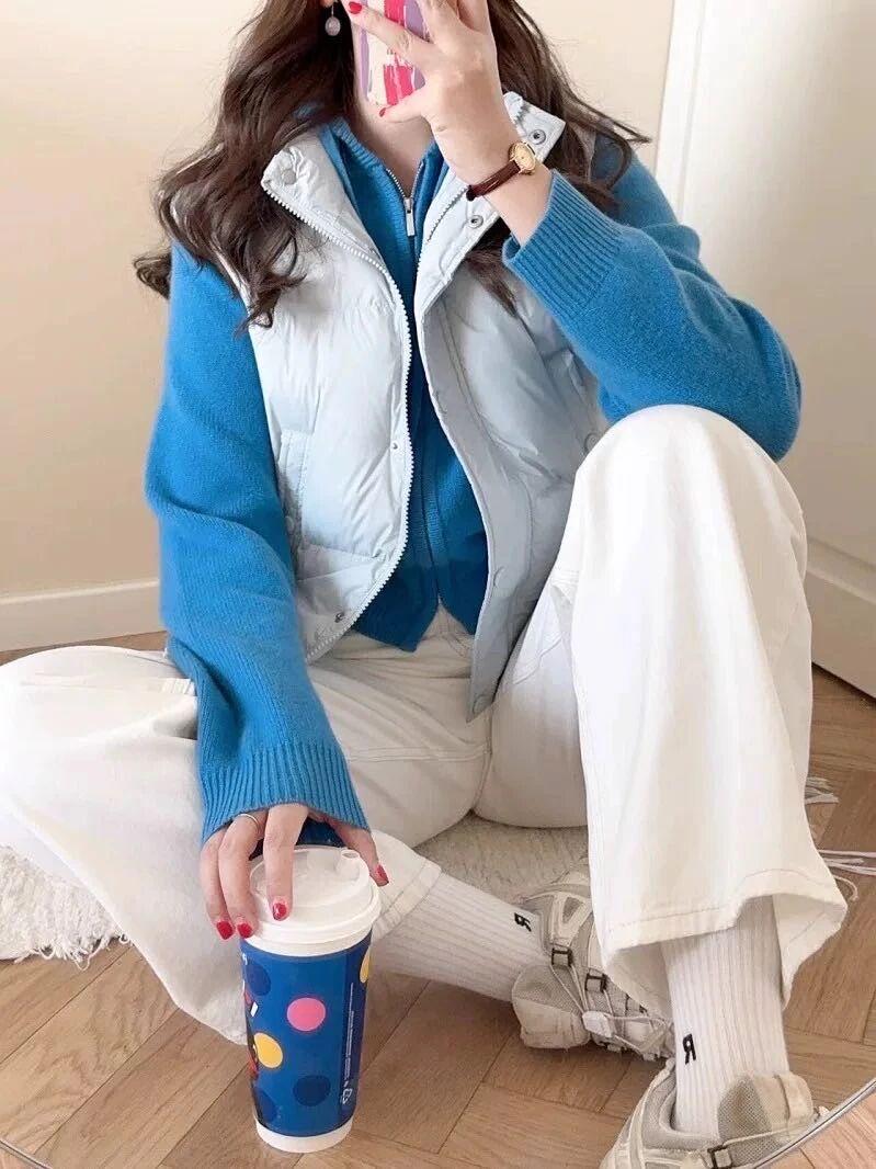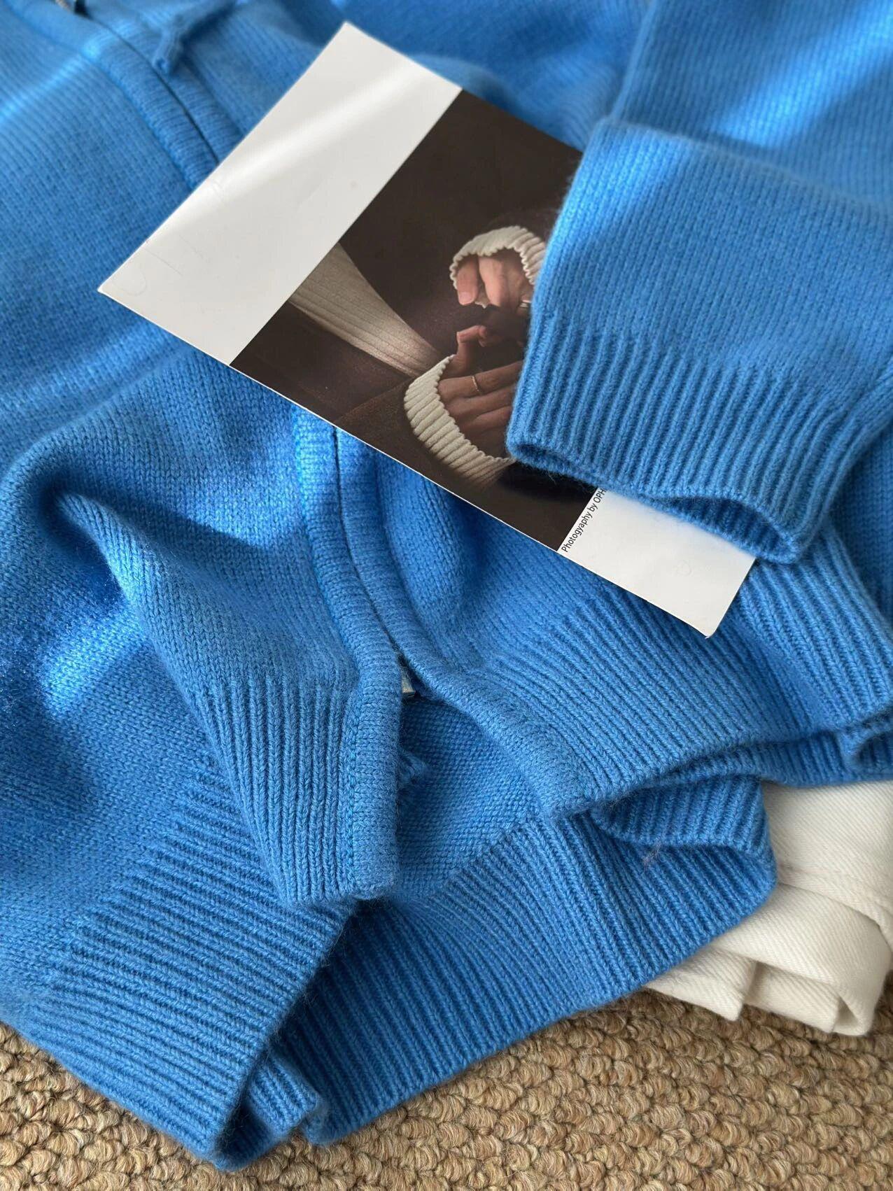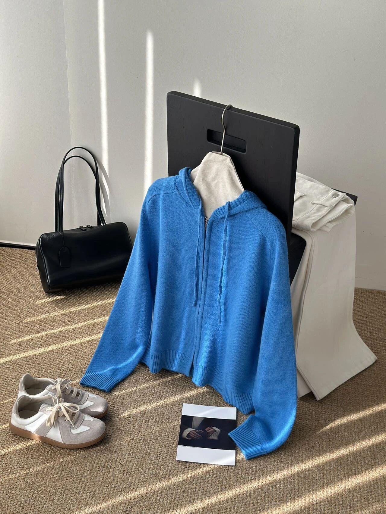 我最近又给大家找到了一款超正超有范儿,爆炸显白的蓝拉链连帽针织开衫。