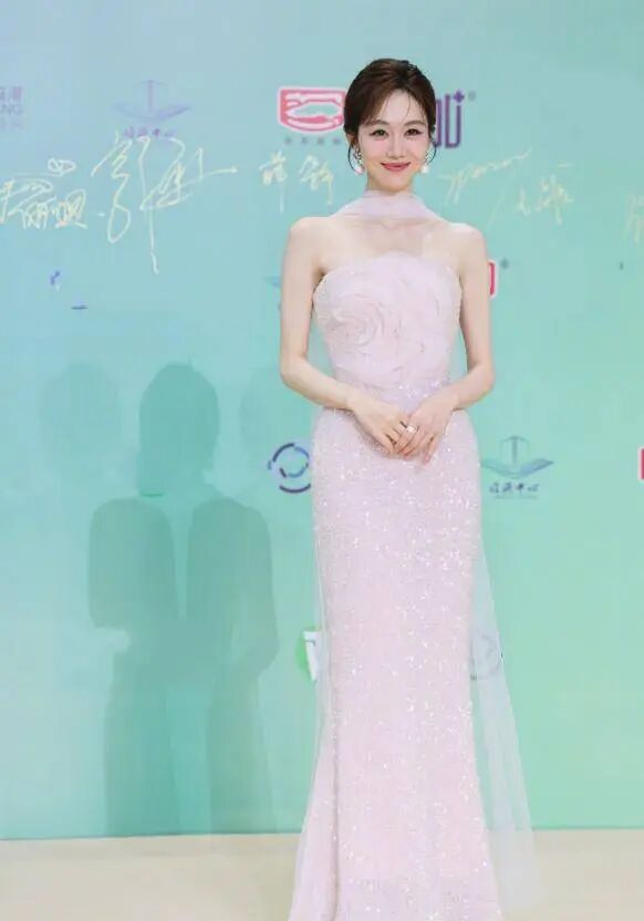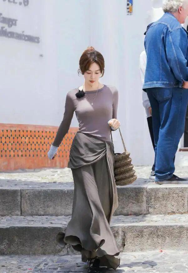 最妙的是她搭的挂脖纱巾——不是死板的披肩,而是轻盈的纱质款,挂在颈间既增加了层次感,又避免了抹胸裙“过于暴露”的尴尬,还悄悄修饰了颈部线条。